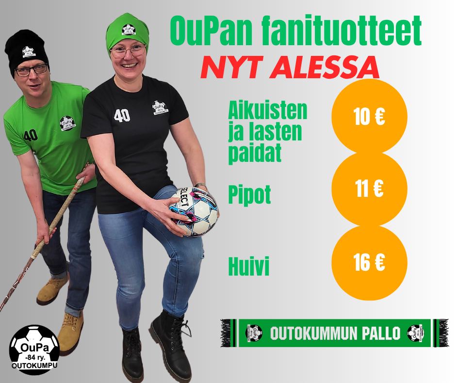 Pipot 11 € (musta koot juniori ja aikuiset, vihreä koko aikuiset), OuPa fanihuivi 16 € , t-paidat 10 € (musta koot M-XXL, vihreä koot M ja L)